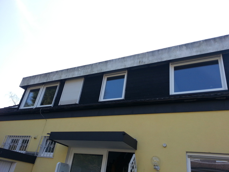 Im Zuge der Sanierung des im Jahre 1970 erstellten Daches wurden auch die Dachüberstände an beiden Giebeln sowie den Traufen verlängert, so dass jetzt ein VWS-System (Vollwärmeschutzsystem) [Abkürzung ausschreiben bzw. in Klammern dahinter] auf die Fassaden aufgebracht werden kann. Nach vorgängiger thermischer Isolierung wurden die Dachausbauten, die Giebel, die Traufen und die Schornsteinköpfe mit Stehfalzblechen verkleidet; darauf abgestimmt wurden neue Dachrinnen und Fallrohre angebracht.
